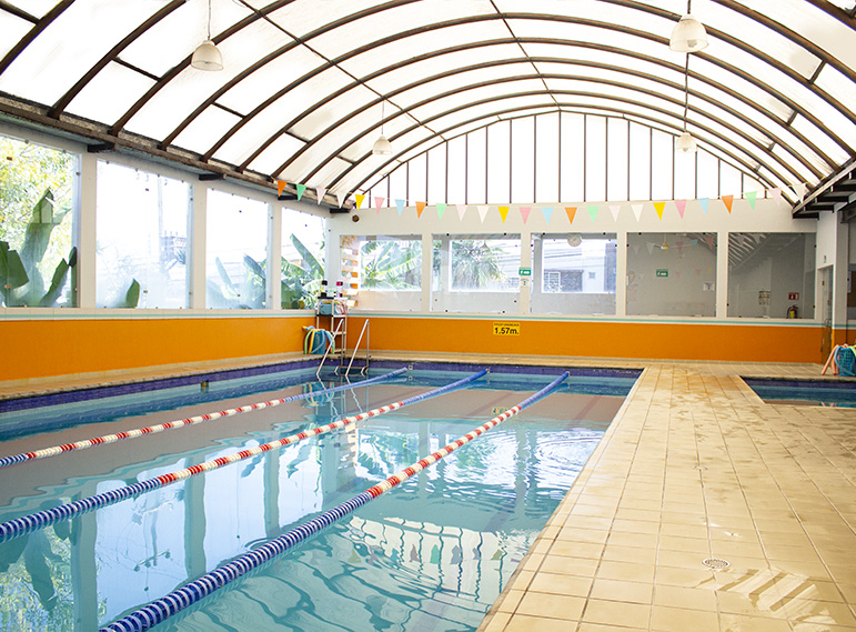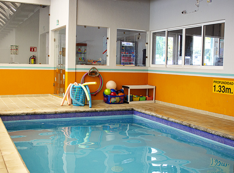 Contamos con dos albercas para hacer diferentes disciplinas de nado y ejercicio, la principal de 20 mts. Con 4 carriles y una profundidad de 1.65 mts. La más pequeña de 5x4 mts. xCon una profundidad e 1.35 mts.